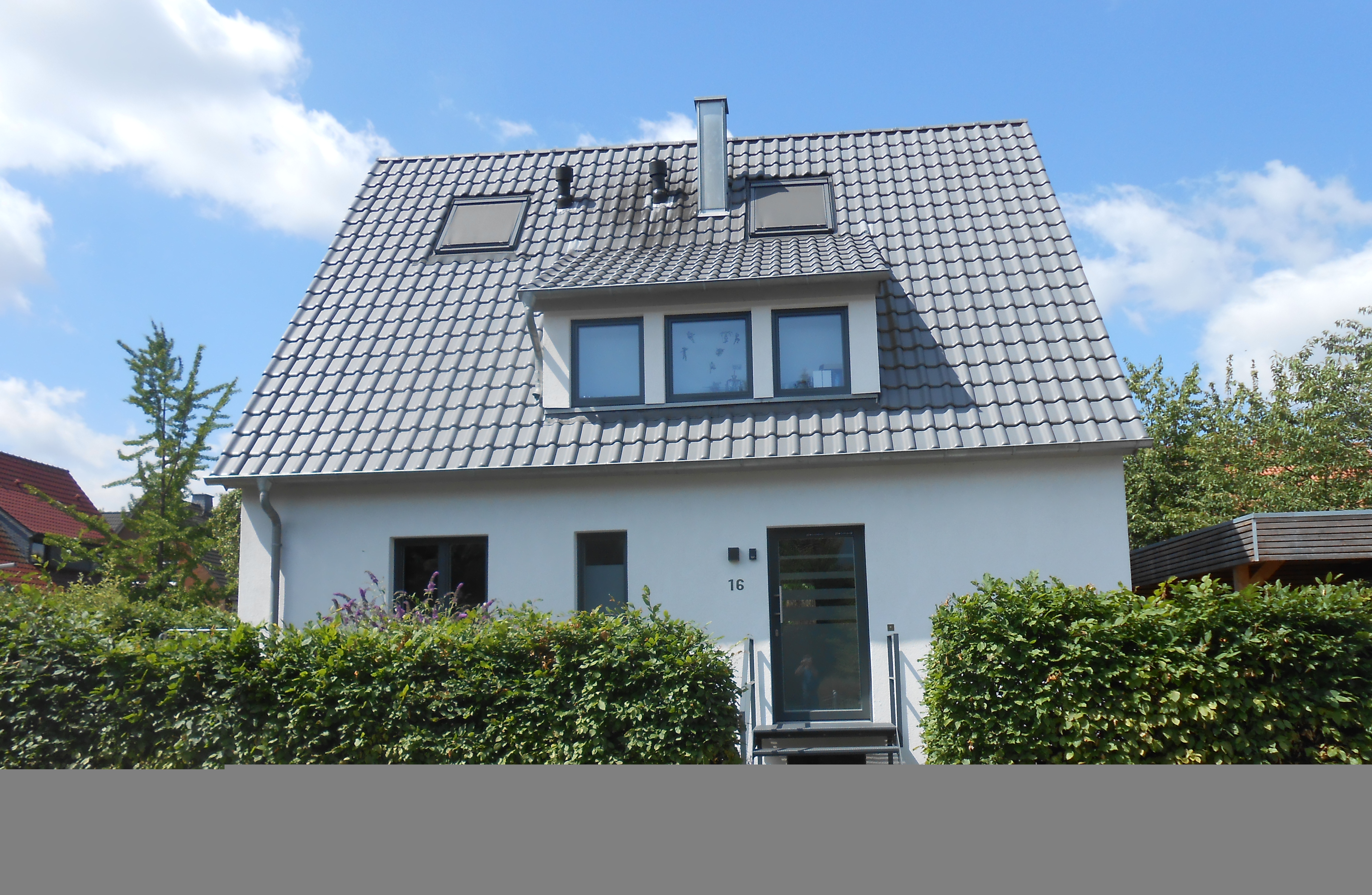 Teilentkernung zur Schaffung größerer Räume und besserer Belichtung. Hochwärmegedämmter Anbau als Holzkonstruktion, Nutzung als Ess- und Wohnzimmer. Neuer, hochwärmegedämmter Dachaufbau und Errichtung einer großen aus 2 kleinen bestehenden Gauben für das neue Kinderzimmer. Neue Fassade mit Wärmedämmverbundsystem und 3- fach-verglasten Holzfenstern, außenliegender Sonnenschutz. Komplett neue Haustechnik, Einbau einer Lüftungsanlage, Solarthermie. Errichtung eines Carports.