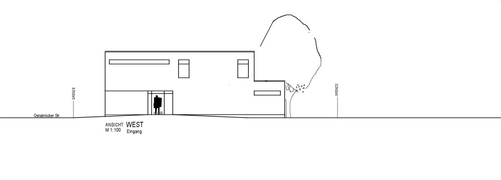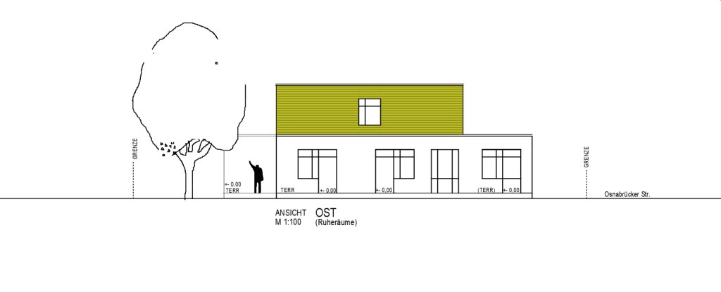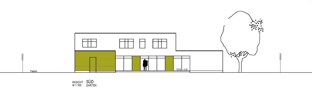 Flachdachnaubau mit rollstuhlgerechten Räumlichkeiten im Erdgeschoss und Verwaltungsräumen im Dachgeschoss.